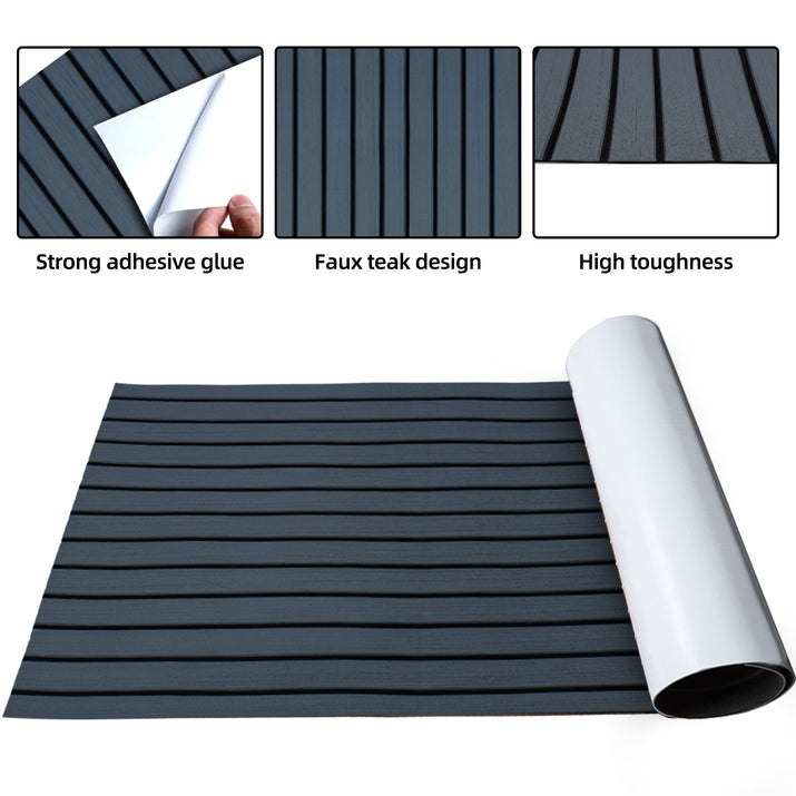 La texture rainurée unique , conçue exclusivement par TeakFoamShop, crée un aspect teck réaliste, offre une adhérence optimale et est facile à nettoyer. La mousse est antidérapante, douce au toucher, hydrofuge et résistante aux UV et à la chaleur. Grâce à sa couche autocollante améliorée, la pose est simple et l'adhérence reste solide longtemps, même dans des conditions difficiles.